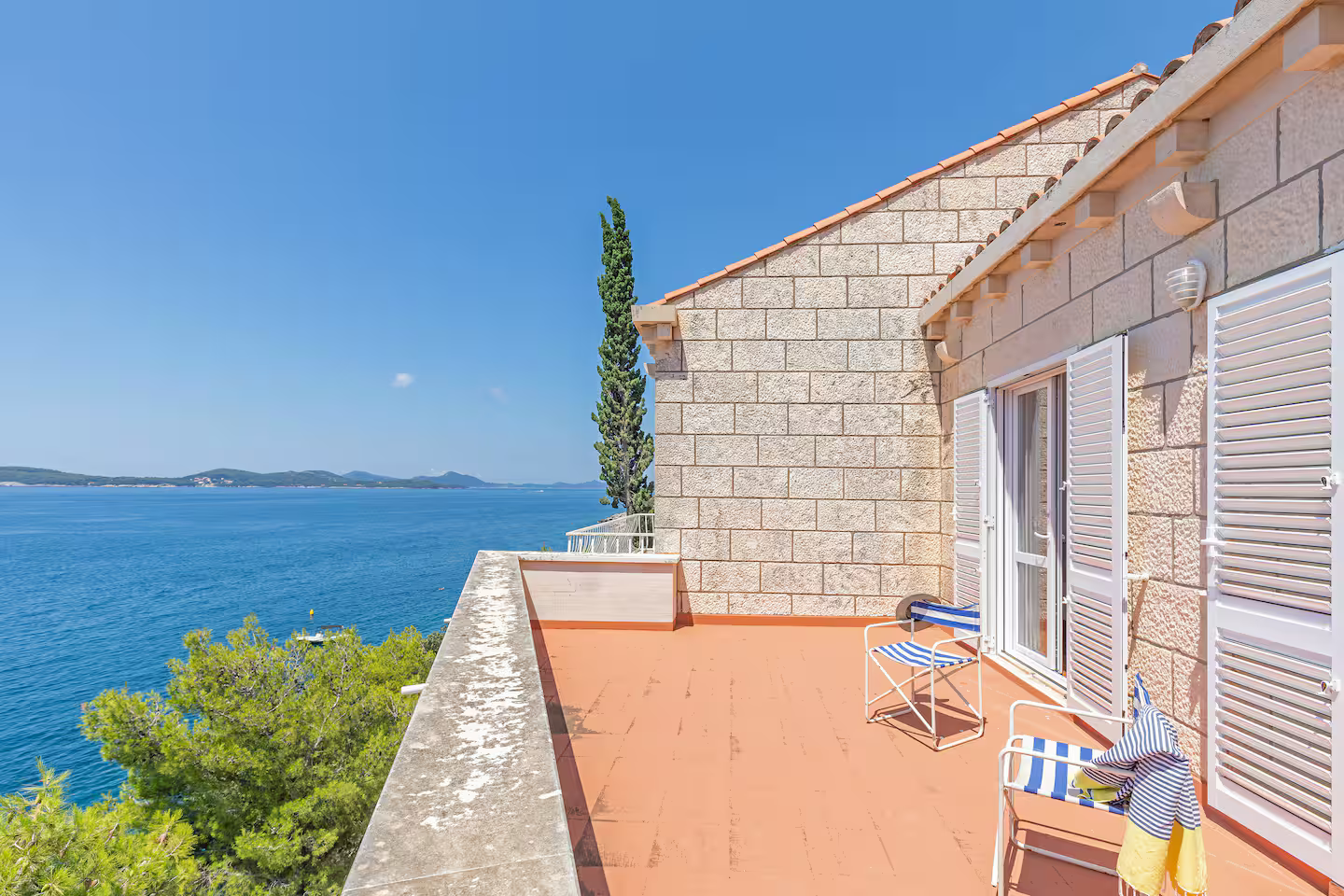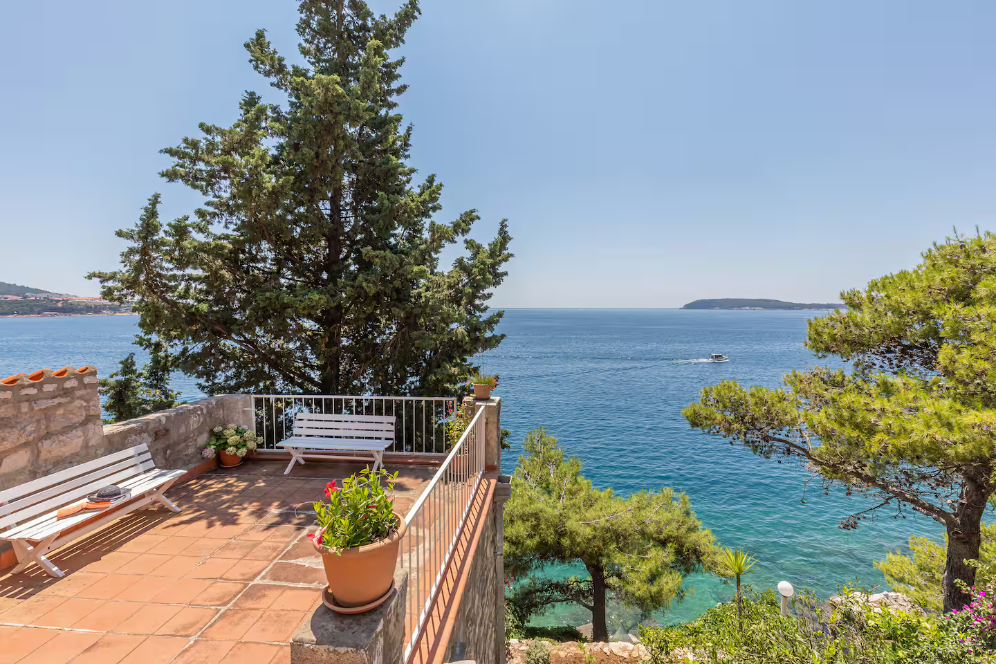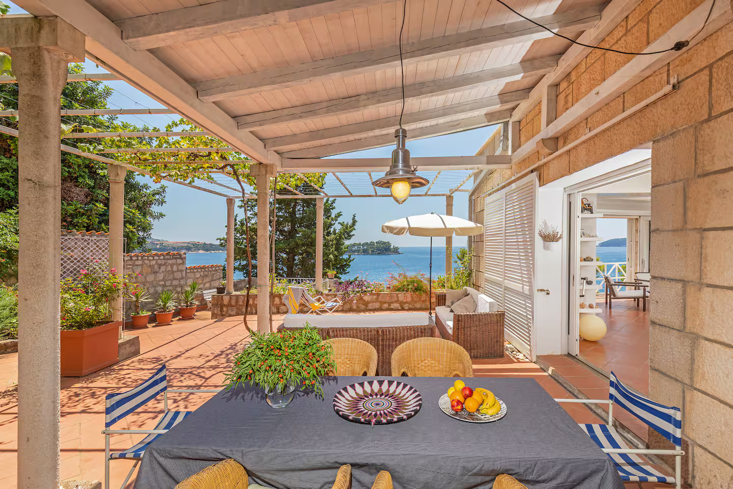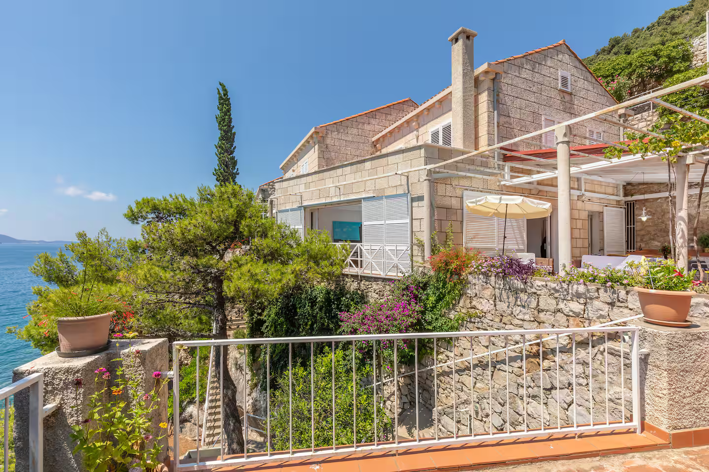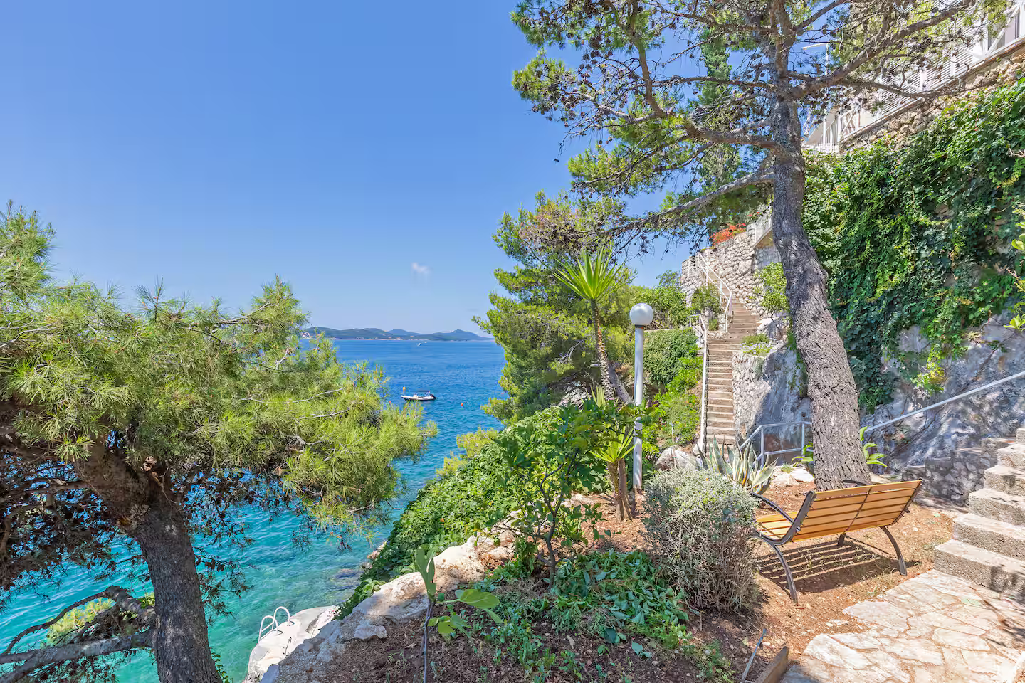 Beachfront Location: Private beach Vila Jana in Dubrovnik offers direct beachfront access with a sun terrace and a lush garden. Guests can relax on the beach or enjoy the outdoor seating area.
